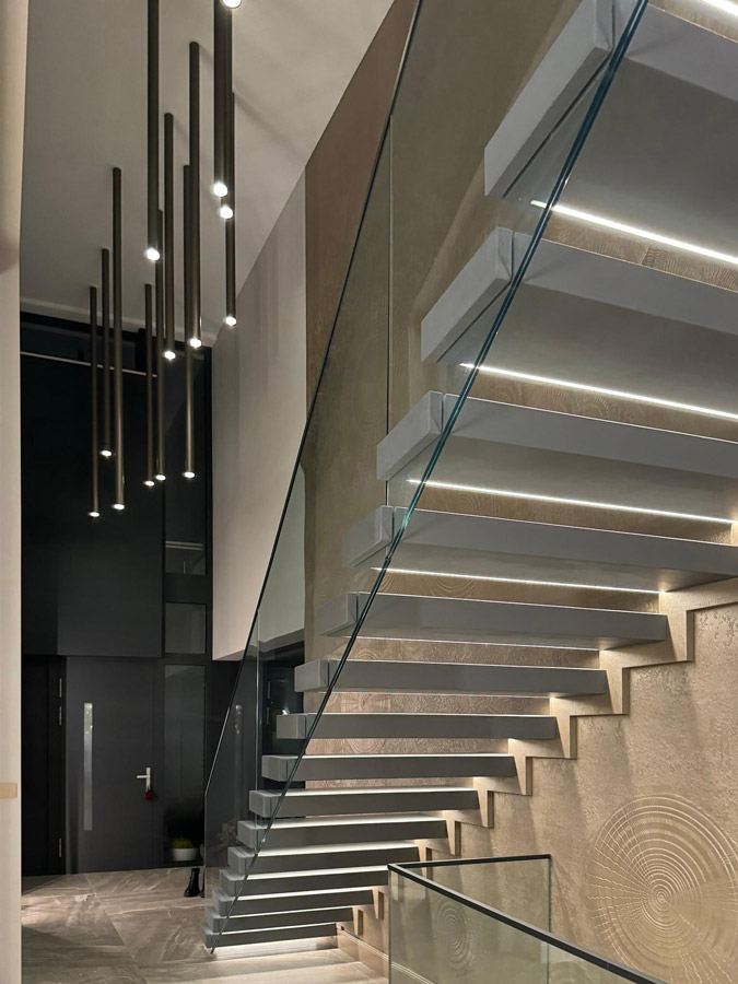 Az exkluzív kivitelű luxusvilla vonalfény megvilágításaihoz speciális betonfödémbe építhető világítási megoldást alkalmaztunk. A belső tereket több helyen egyedi tervezésű kristálylámpáink díszítik.